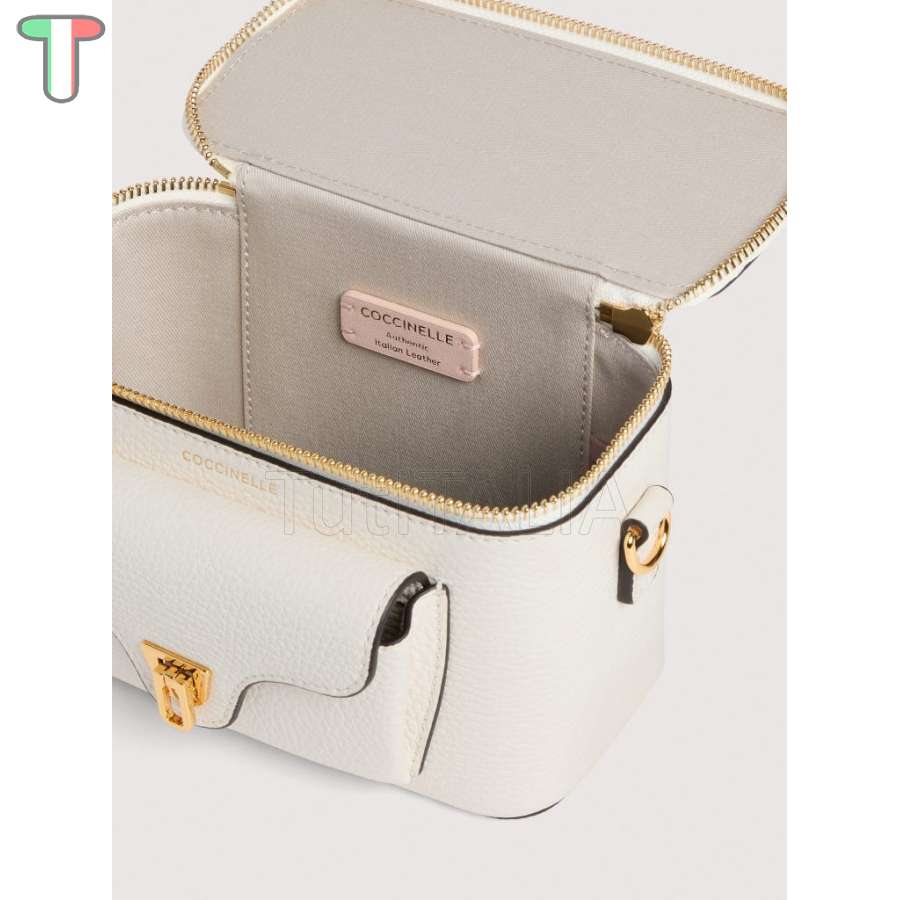 Коллекция 2026 SS.  Производитель: Coccinelle.  Тип изделия: мини-сумка.  Материал: натуральная кожа.  Цвет: белый.  Гарантия 2 года.  Ремень на плечо регулируемый.  Размеры: 18x12x8 см.  Высота ручки: 18 см.  Вес: 0.5 кг.
